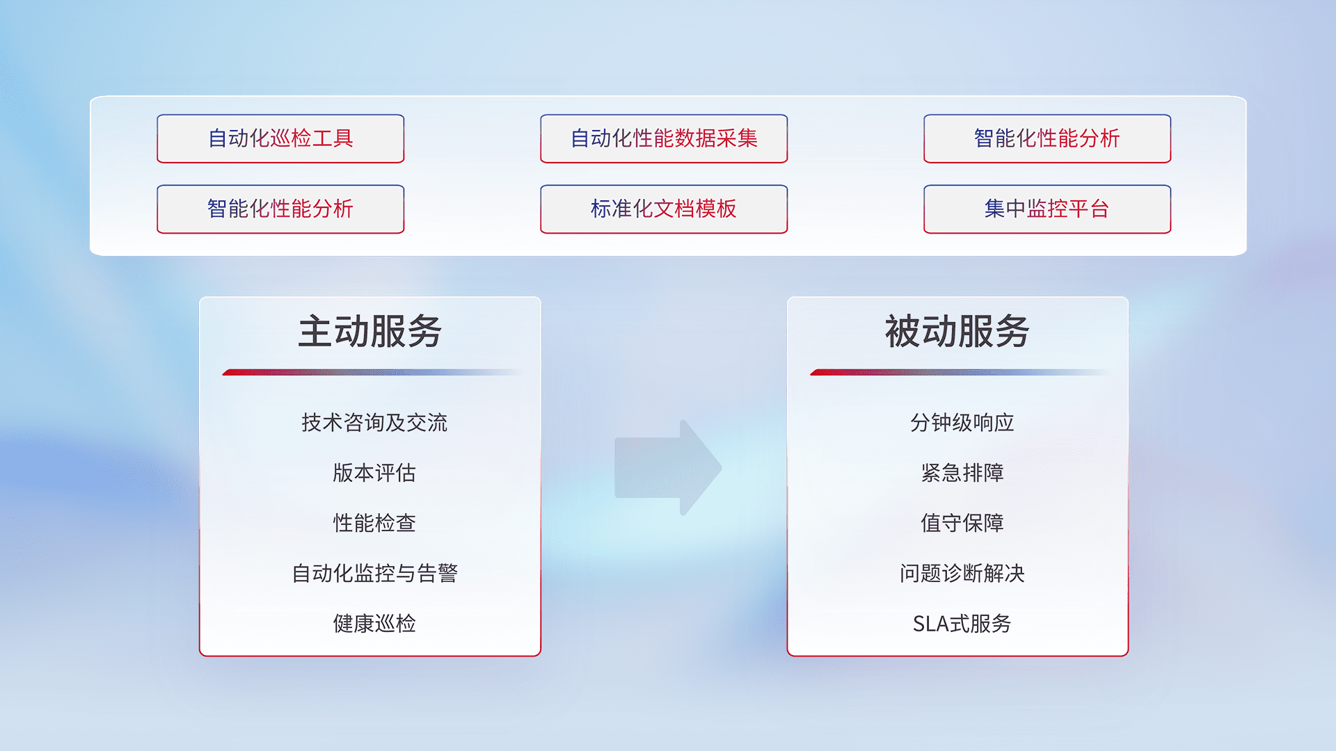 智能化工具和标准化文档,,,保障服务质量,,,,提供主动服务(包含技术咨询、、版本评估、、、、性能检查、、自动化监控与告警、、、、健康巡检)和被动服务包含(分钟级响应、、、、紧急排障、、、、值守保障、、、问题诊断解决、、、、SLA服务)。。。。