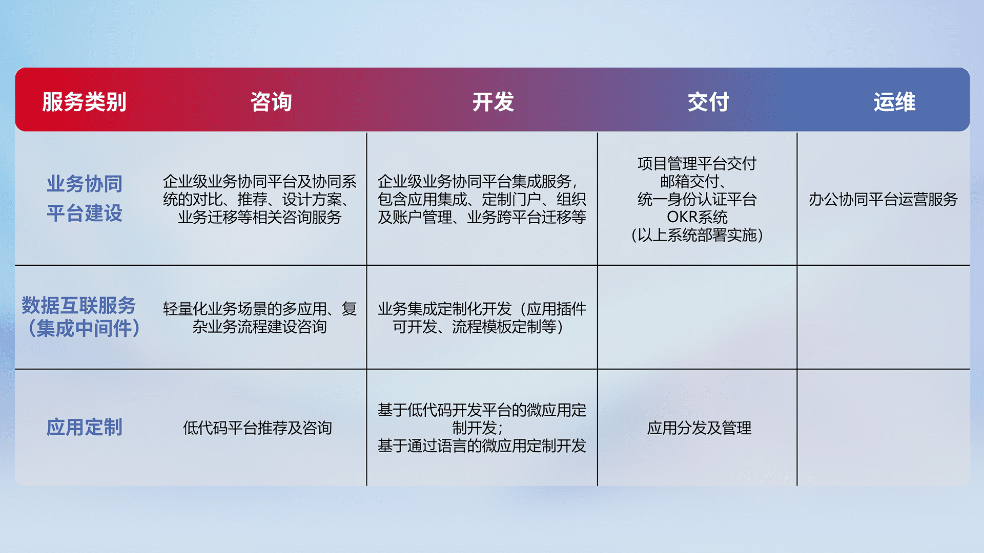 针对钉钉、、、企微、、IDaas等平台级产品提供产品的规划、、、方案、、、、交付、、、定制化开发等服务,,实现如统一协同办公、、、、智能客户服务、、混合会议管理、、、智能数据查询、、、、等业务场景,,,实现数字化转型。。。。